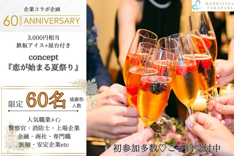 8月17日(日) 12:00〜15:00 60周年企画コラボ\60名合コン♡式場de恋活/《3,000円相当の屋台♡鉄板アイス付き》×《初参加多数で魅力的な方と出会う♡》 – 婚活パーティーならLINK×LINK